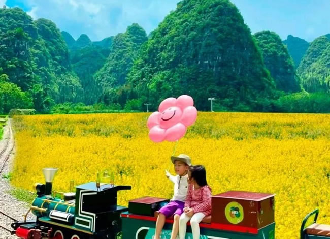 乘坐空調(diào)旅游觀光列車出發(fā),列車上來自興義的阿哥阿妹帶領(lǐng)大家感受濃濃 的布依族風(fēng)情,一起載歌載舞,感受春日的美好浪漫。