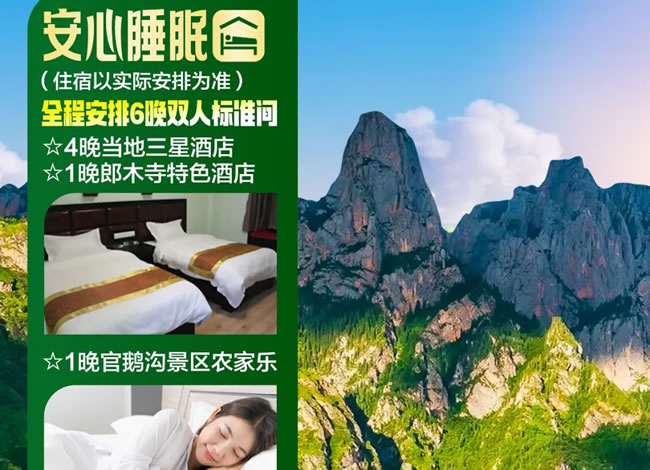 3、住宿:全程5晚商務(wù)型雙人標(biāo)準(zhǔn)間+1晚官鵝溝景區(qū)為農(nóng)家樂(lè)。(以實(shí)際安排為準(zhǔn))