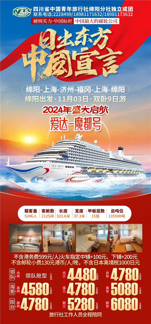 綿陽中旅假日旅行社于2024年10月9日在市工會大廈成功舉行“愛達(dá)·魔都號豪華郵輪9日游”旅游線路推薦會。現(xiàn)場主持人向到場的嘉賓們詳細(xì)的介紹了濟(jì)州、福岡等地的風(fēng)土人民、美食、美景以及出游的相關(guān)注意事項等內(nèi)容,受到了嘉賓們的熱烈歡迎和關(guān)注。服務(wù)熱線:0816-2228499/2238477 。