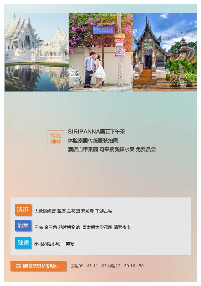 早餐后前往清邁機(jī)場乘坐飛機(jī)返回成都,結(jié)束愉快的旅程!